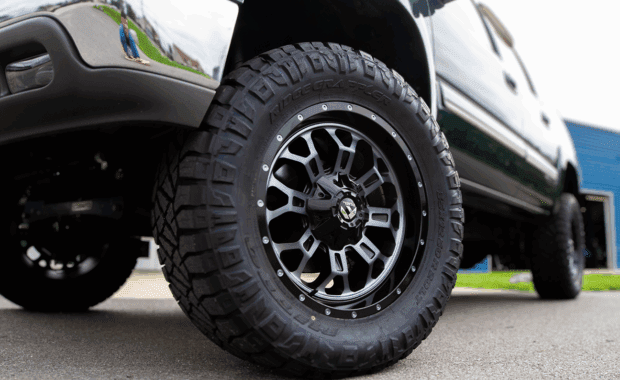 Wheels & Tires: 20X9 +1 Fuel Crush Gloss Double Dark Tint 8X165.1 | 35X12.50R20 Nitto Ridge Grappler